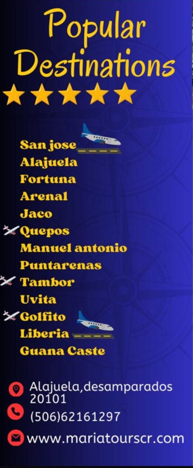 Private transportation with María Tours offers a unique blend of flexibility, comfort, safety, and personal touch with our private transportation service. Our service includes door to door transportation from your hotel ,airports, or any other location in Costa Rica. We can accommodate groups as well as individuals and offer different units for your comfort